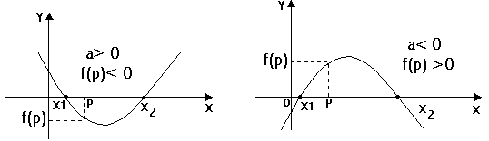 Observe as figuras acima, onde p é um número real situado entre as raízes, como exige o problema, ou seja: x1 < p < x2.