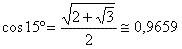 Usando uma calculadora (a do Windows serve) e efetuando o cálculo acima encontramos para o cosseno de 15 graus, o valor 0,9659, que pode ser obtido também diretamente através consulta à tábua trigonométrica, que normalmente comparece como apêndice de livros de Matemática do segundo grau.