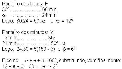 Questão 21 - O menor ângulo formado pelos ponteiros de um relógio circular, ao marcar 15 h e 24 min., é: