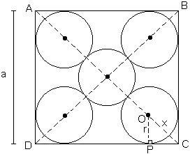 ITA – 1965) Dentro de um quadrado de lado a existem cinco círculos não superpostos de mesmo raio r.  O centro de um dos círculos coincide com o centro do quadrado e ele tangencia os outros quatro círculos cada um dos quais tangencia dois lados do quadrado (cada um está num canto do quadrado). Exprimir r em termos de a.