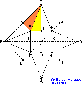 Os triângulos CMN, BMP, APO e DON são as faces laterais da pirâmide, rebatidas sobre o plano da base. Os pontos M, N, O e P são os vértices da base quadrada da pirâmide.