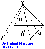 DICA: Observe que VM nesta figura, corresponde a CJ na figura do problema resolvido acima e, portanto, é igual a Ö 18. Para calcular a altura H da pirâmide, aplique o Teorema de Pitágoras no triângulo retângulo