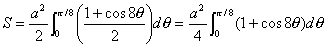 Pela figura, vê-se facilmente que basta calcular a área da meia pétala limitada entre 0 e p/8 radianos e multiplicar o resultado por 16 para obter a área total, uma vez que as 16 semi-pétalas formam a rosácea de 8 pétalas.