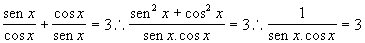 Daí, vem: 1 = 3 . senx . cosx \ senx . cosx = 1 / 3. Ora, sabemos que
