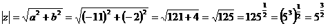 Temos um número complexo da forma z = a + bi = –11 – 2i , onde a = – 11 e b = -2; portanto, o seu módulo é igual a