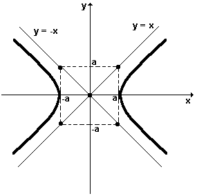Veja a seguir, o gráfico de uma hipérbole equilátera x2 – y2 = a2  referida ao plano cartesiano xOy: