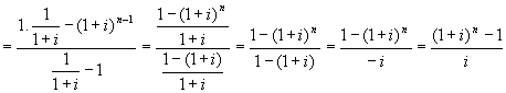 Observe que a expressão entre colchetes, é a soma dos n primeiros termos de uma progressão geométrica de primeiro termo (1+i)n-1, último termo 1 e razão 1/(1+i).